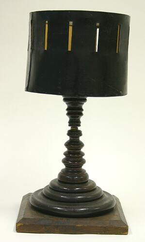 Zoetrope composed of a cylinder and stand. The exterior of the cylinder is black and lacquered. Thirteen viewing slots perforate the upper half of the cylinder at regular intervals. The interior of the cylinder has a strip of paper pasted onto its wall underneath the slots. This paper features 13 sequential images of a man whose head falls off, then reattaches itself. The images are produced in black, blue and red ink. The base of the cylinder is covered with a geometric patterned paper of black, red, yellow, green and white. The centre of the base has a brass coloured candle holder, with candle in situ. The zoetrope stand is of turned wood, fixed to a square base plate. A brass mechanism in the upper part of the stand allows the cylinder to spin.