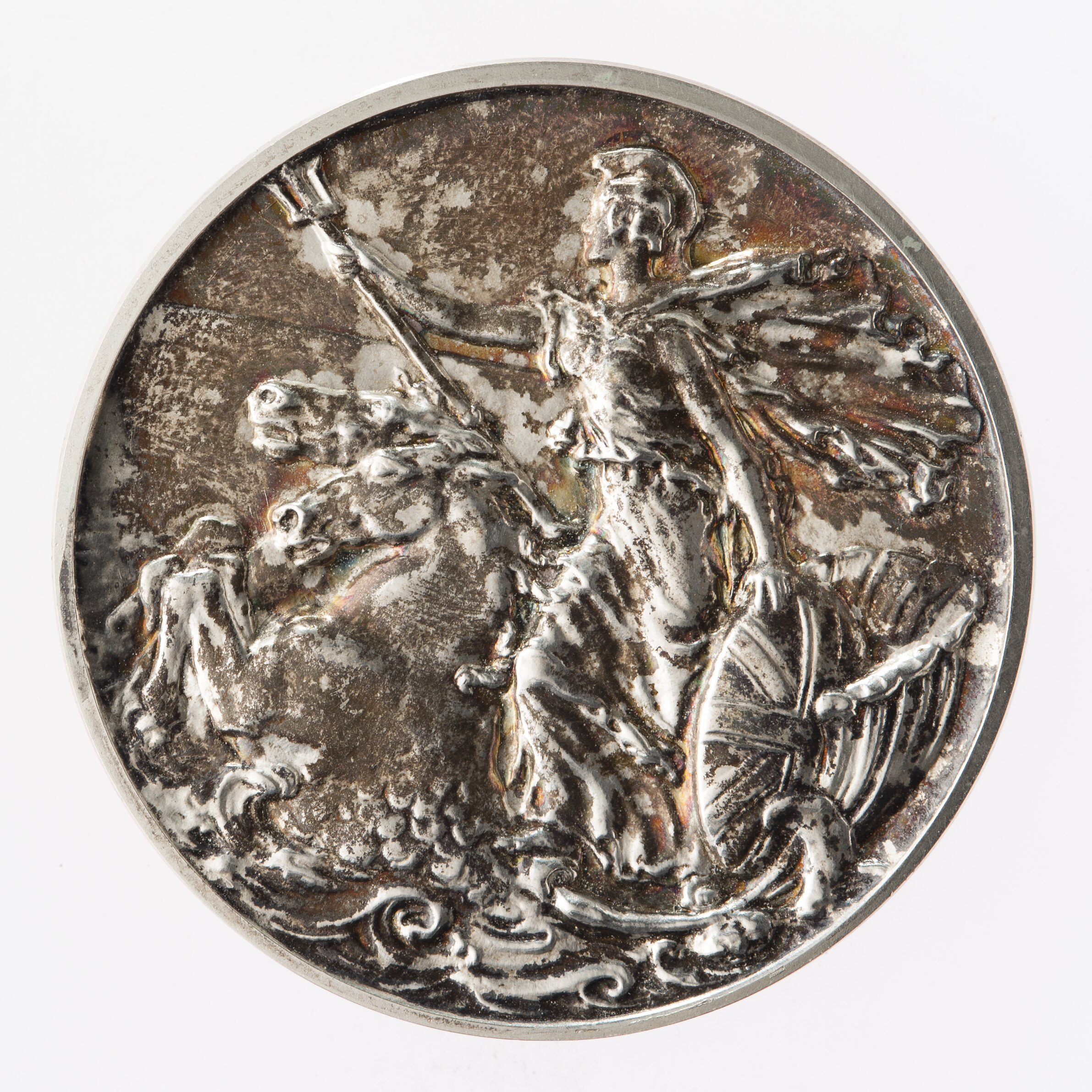 Britannia standing on the back of a pair of hippocampi advancing rapidly through the oceans to left; in her right hand she brandishes a trident while in her left she steadies an oval shield bearing the Union flag.