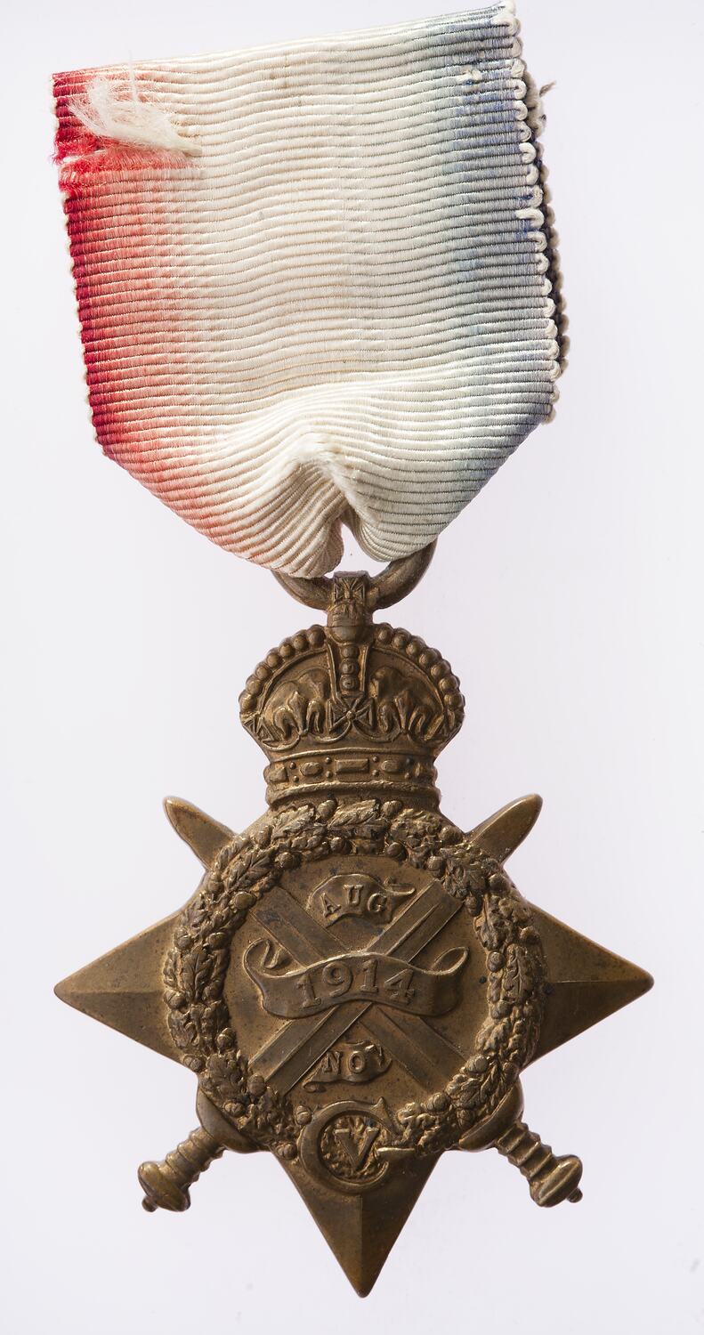 A four pointed bronze star with the top point replaced by a crown with attached loop, crossed swords project between the points of the star and at the centre, within an oak wreath, a scroll wrapped around the swords reads AUG 1914 NOV; at the base of the wreath is a large G which encloses a V (King George V).