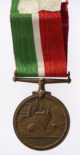 A round bronze medal (36 mm diameter) with mount and ribbon. The obverse features a bare head of George V facing left; around, GEORGIVS V BRITT: OMN; REX ET IND: IMP; the artist's initials, B.M. (Bertram MacKennal) on the neck truncation. The reverse depicts a merchant navy ship ploughing through rough seas with a sinking submarine and sailing ship in the background on the right; in exergue, FOR . WAR . SERVICE MERCANTILE . MARINE . 1914 - 1918 .The edge is impressed: W.J. SMITH . AUSTRALIA . 151 .
