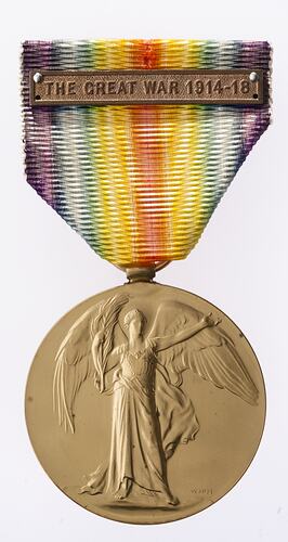 The Victory Medal was authorised in 1919 and was awarded to army, navy and air force personnel who served in a theatre of war between midnight 4th-5th August 1914 and midnight 11th-12th November 1918. The bar attached by pins to this specimen may be a rejected version.