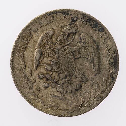 8 Reales coin, Mexico, 1880 AD. Recovered from the German light cruiser SMS Emden after being defeated in a battle with HMAS Sydney, in the Battle of Cocos, November 1914.