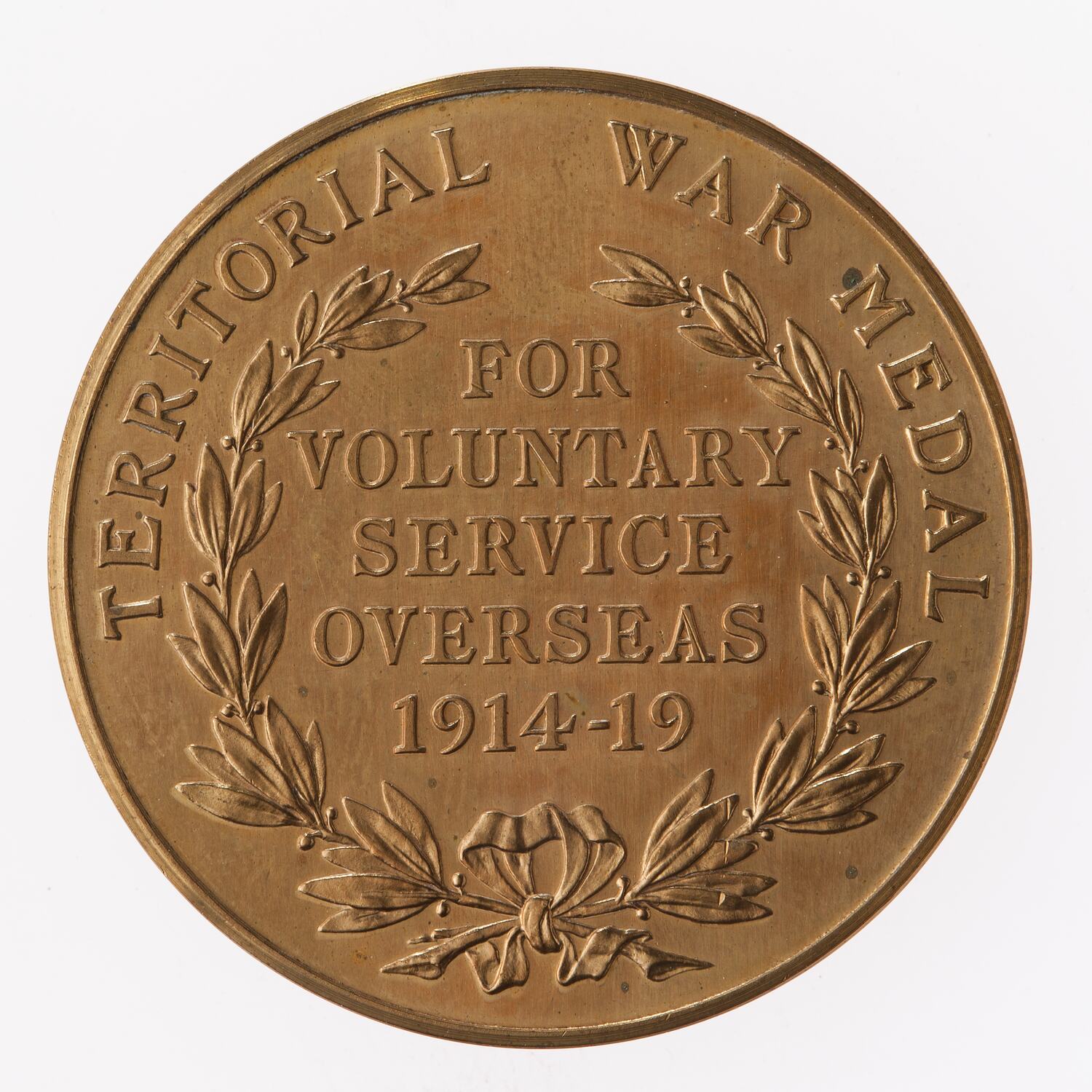 The legend FOR VOLUNTARY SERVICE OVERSEAS 1914 - 19 within a laurel wreath; around outside the wreath, TERRITORIAL WAR MEDAL