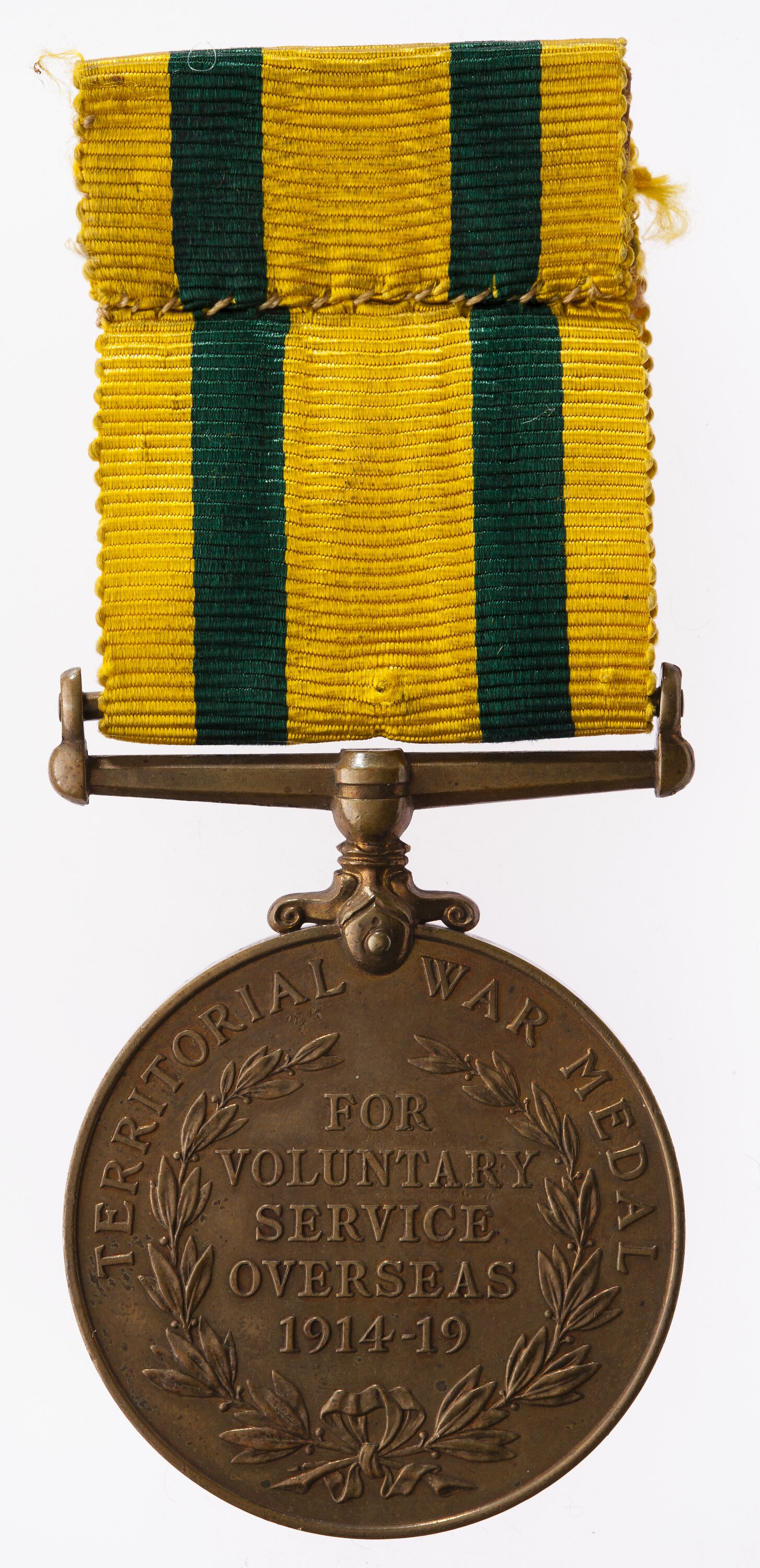 The legend FOR VOLUNTARY SERVICE OVERSEAS 1914 - 19 within a laurel wreath; around outside the wreath, TERRITORIAL WAR MEDAL