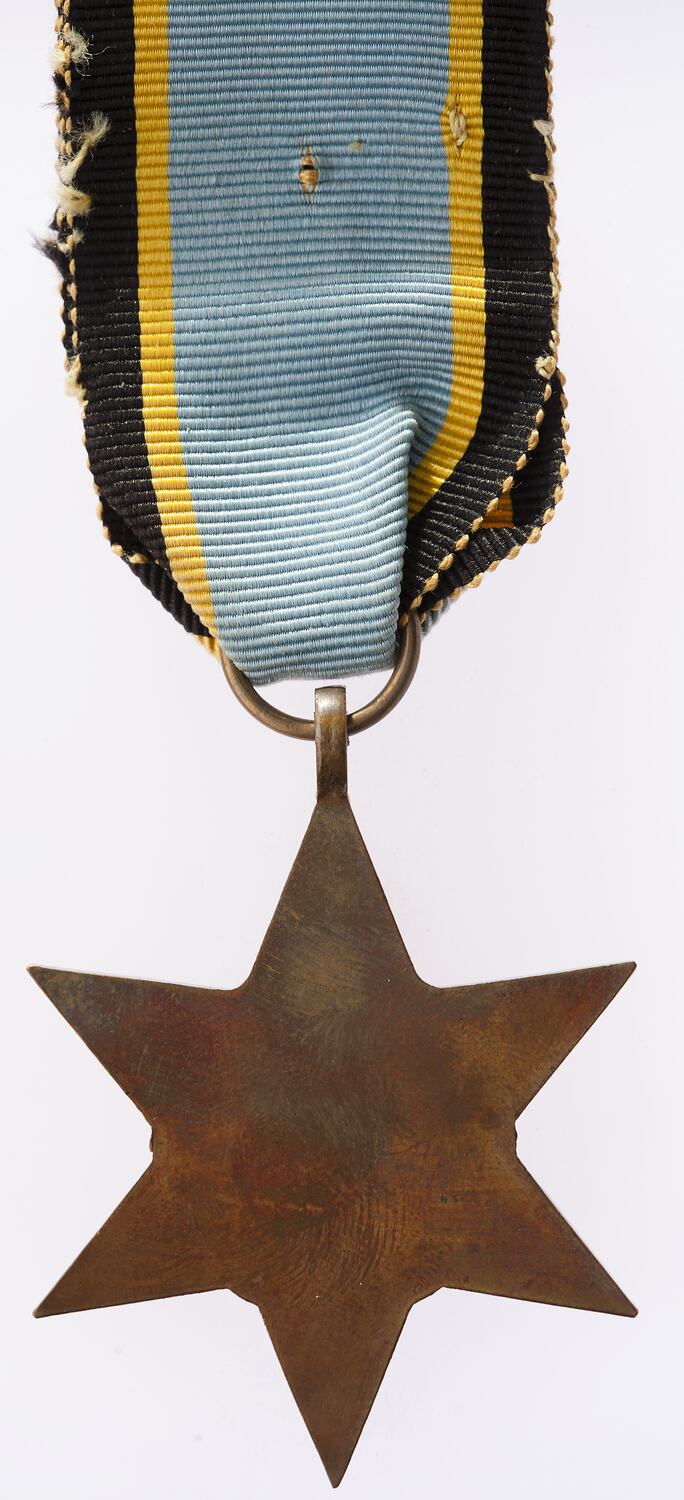 A six pointed bronze star with loop and attached ribbon from top. The obverse features, below a crown, the Royal cypher GRI above VI (Translation- George VI King and Emperor); around THE AIR CREW EUROPE STAR. The reverse is plain.