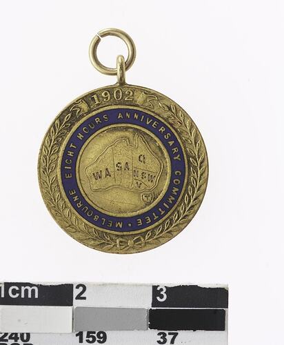 Map of Australia showing six states, inscribed WA / SA/ Q / NSW / V / T. Around, blue enamel ring inscribed MELBOURNE EIGHT HOURS ANNIVERSARY COMMITTEE. Around ring, laurel wreath.1902 at top