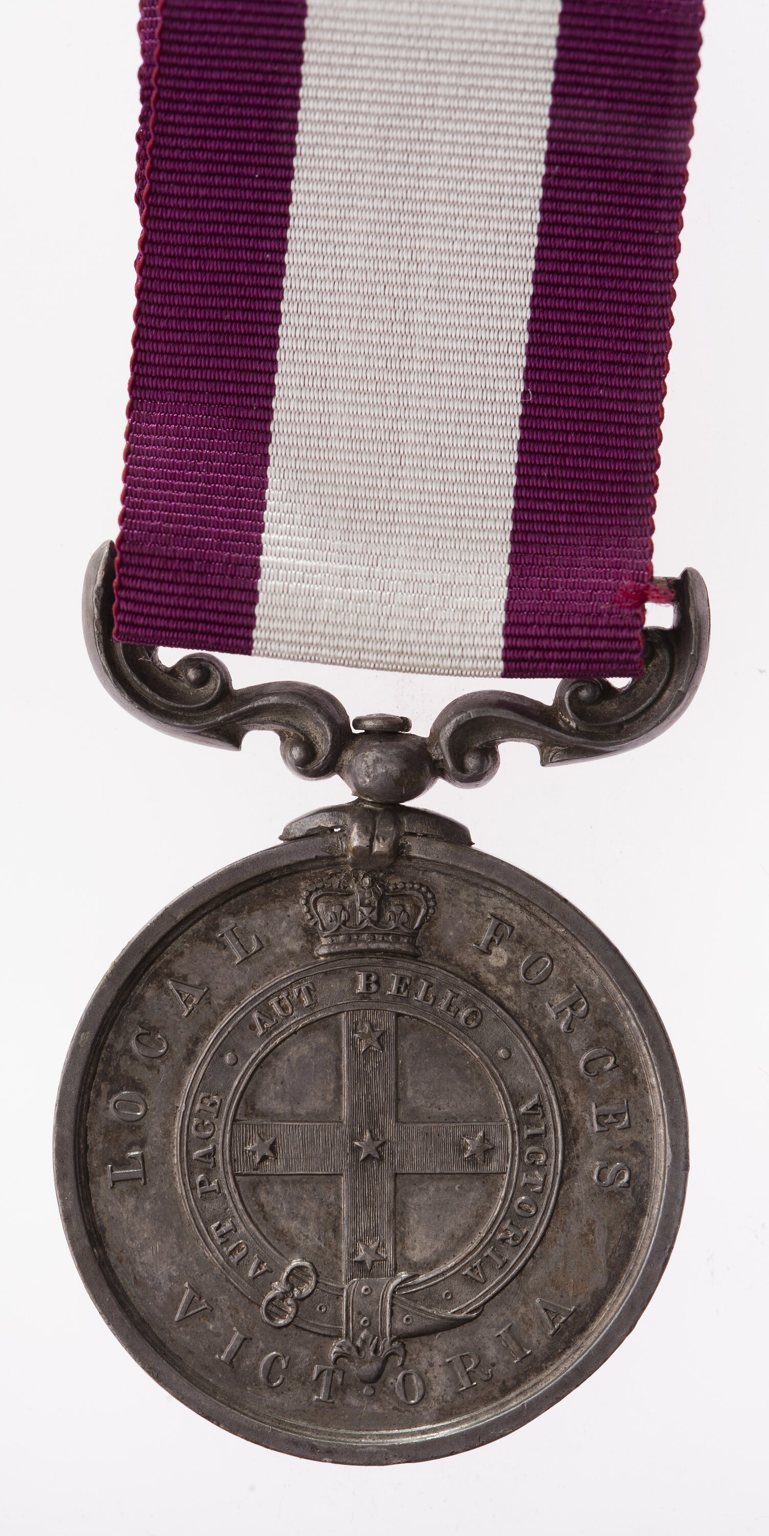 Crowned garter around simple Southern Cross on cross; on garter, AUT PACE . AUT BELLO . VICTORIA; around, LOCAL FORCES VICTORIA