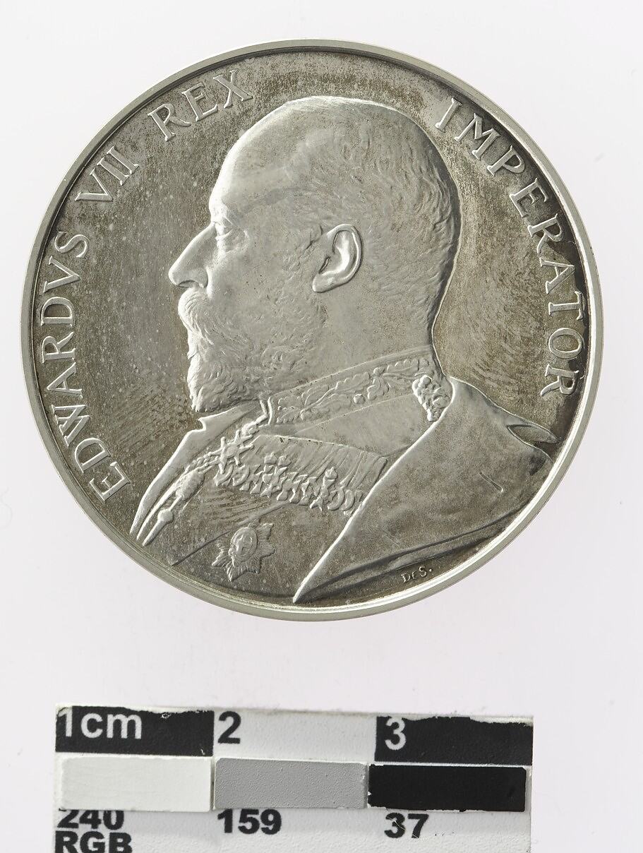 A bust of Edward VII in field marshal's uniform, head bare facing left; around, EDWARDVS VII REX IMPERATOR; the artist's initials DES (William de Saulles) below the bust.