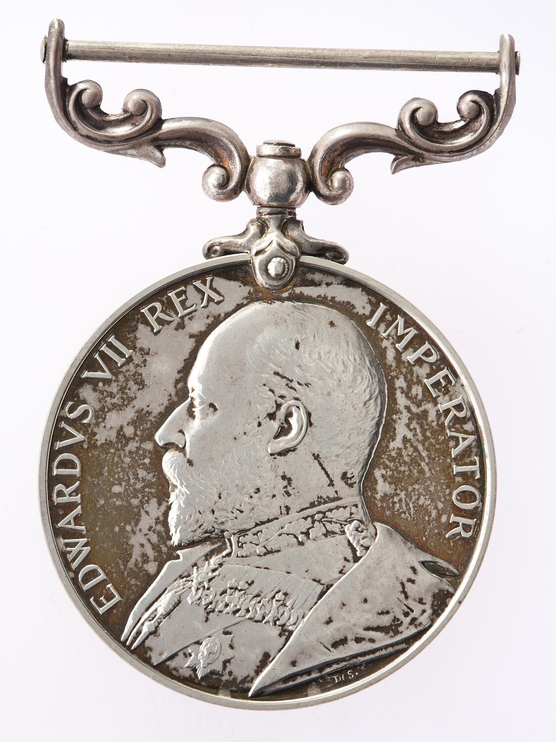 A bust of Edward VII in field marshal's uniform, head bare facing left; around, EDWARDVS VII REX IMPERATOR; the artist's initials DES (William de Saulles) below the bust.