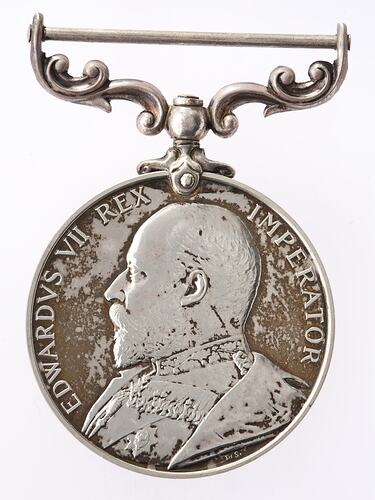 A Royal Mint specimen round silver medal (36 mm. diameter) with mount and ribbon. The obverse features a bust of Edward VII in field marshal's uniform, head bare facing left; around, EDWARDVS VII REX IMPERATOR; the artist's initials DES (William de Saulles) below the bust. The reverse has the legend FOR MERITORIOUS SERVICE within a laurel wreath and below a crown; above the crown, VICTORIA.