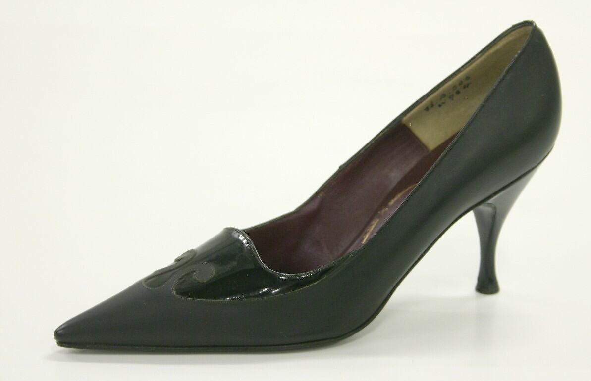 Closed, pointed toe, combining matte and patent leather. Two scrolls on upper front of shoe. Leather scrolls on the patent leather; heel in patent leather. Hand-lasted.