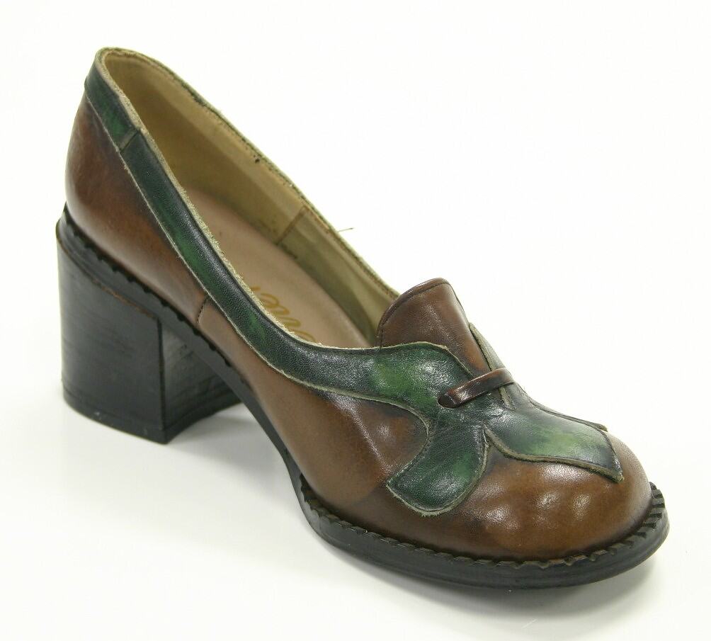 One Pierre Fontaine, Paragon left shoe, size 6b, comprised of tan and brown leather, with a low, flat sole. Toe is rounded; the front has a green trim that becomes leaf motif in front of toe. Resin sole.
