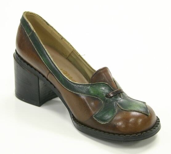 One tan and brown leather Paragon shoe, Pierre Fontaine label, with a green leather leaf motif on the front. Date unknown (possibly 1970s).