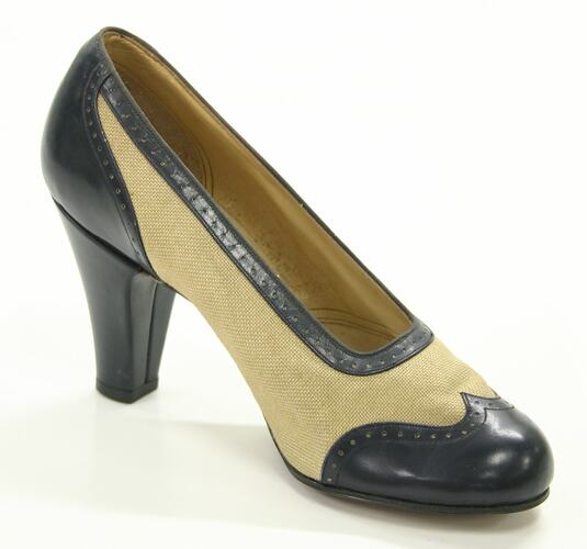 Two-toned gangster closed, round-toed shoe. Navy toe, back and heel. Also fine navy detail on outside edges of shoe. Remainder of shoe is fawn linen. Handwritten inscription in black ink on sole.