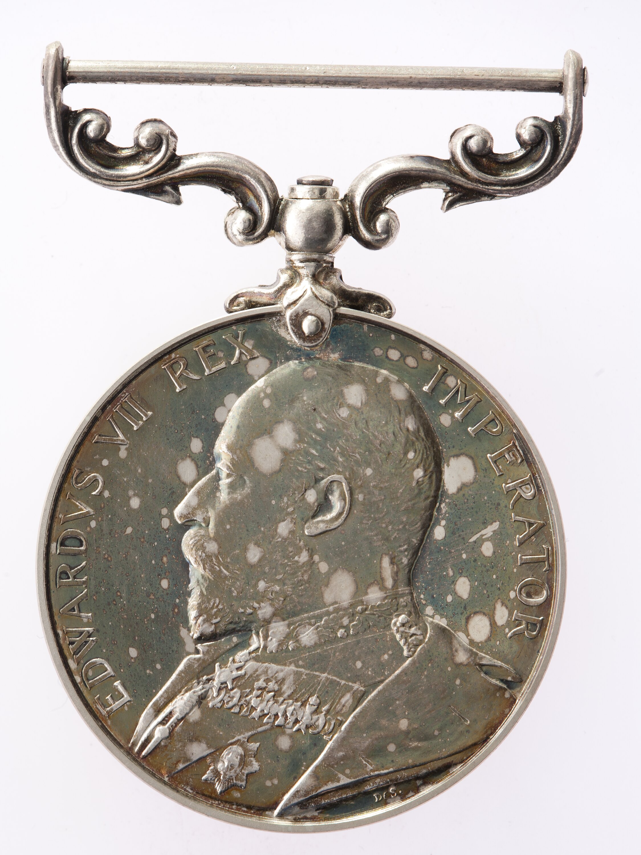 A bust of Edward VII in field marshal's uniform, head bare facing left; around, EDWARDVS VII REX IMPERATOR; the artist's initials DES (William de Saulles) below the bust.