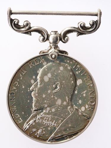 A Royal Mint specimen silver medal (36 mm. diameter) with mount for ribbon. The obverse features a bust of Edward VII in field marshal's uniform, head bare facing left; around, EDWARDVS VII REX IMPERATOR; the artist's initials DES (William de Saulles) below the bust. The reverse has the legend NEW SOUTH WALES FOR LONG SERVICE AND GOOD CONDUCT.