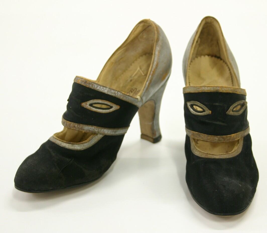 Pair of black and satin silver 'up-front' Paragon shoes, with high heel and closed, rounded toe and strap. Made in the 1930s, they were given to the donor for her shoe collection by a person whose mother had worn them.