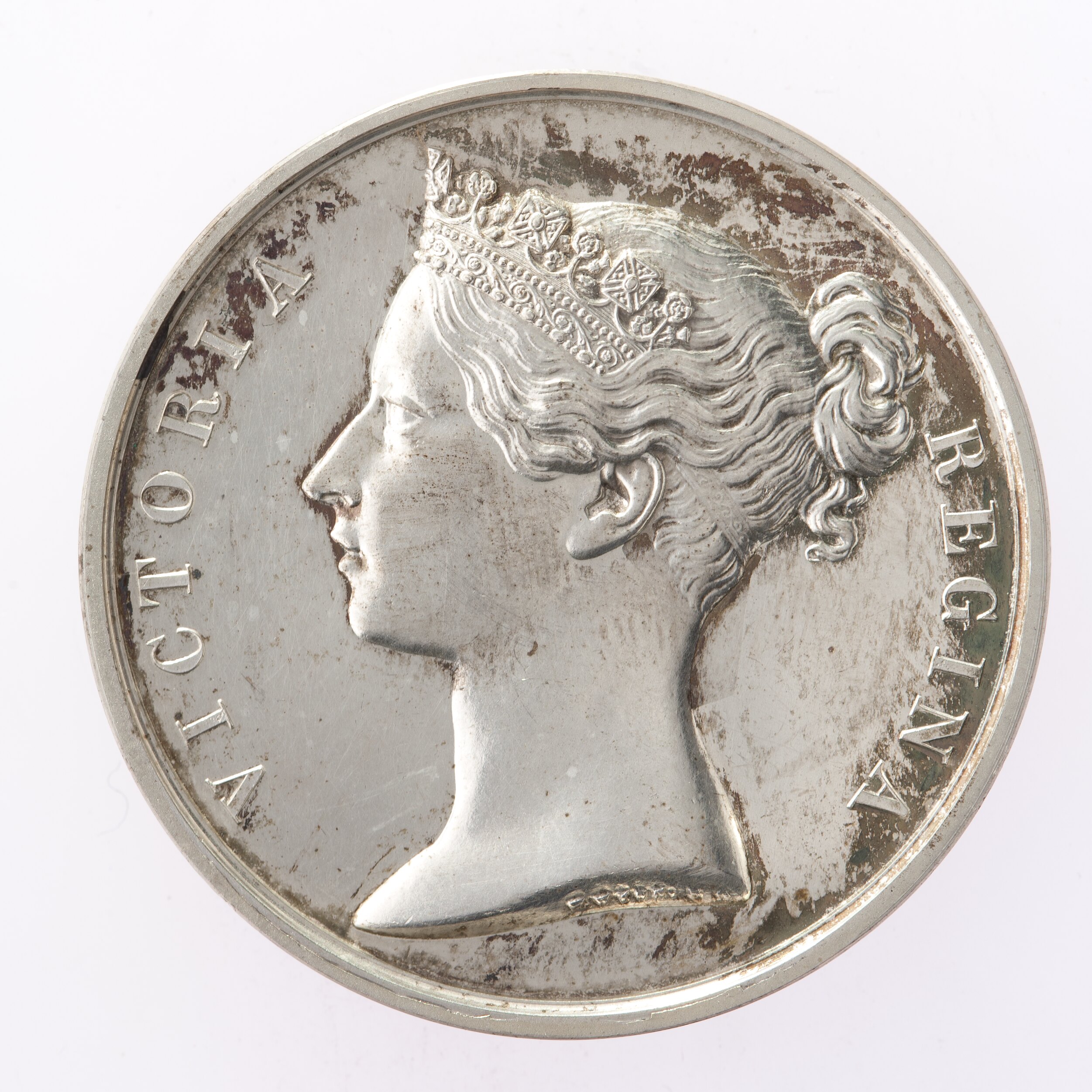 A diademed head of Queen Victoria, facing left; around, VICTORIA REGINA; the artist's name W.WYON R.A. on the bust truncation.