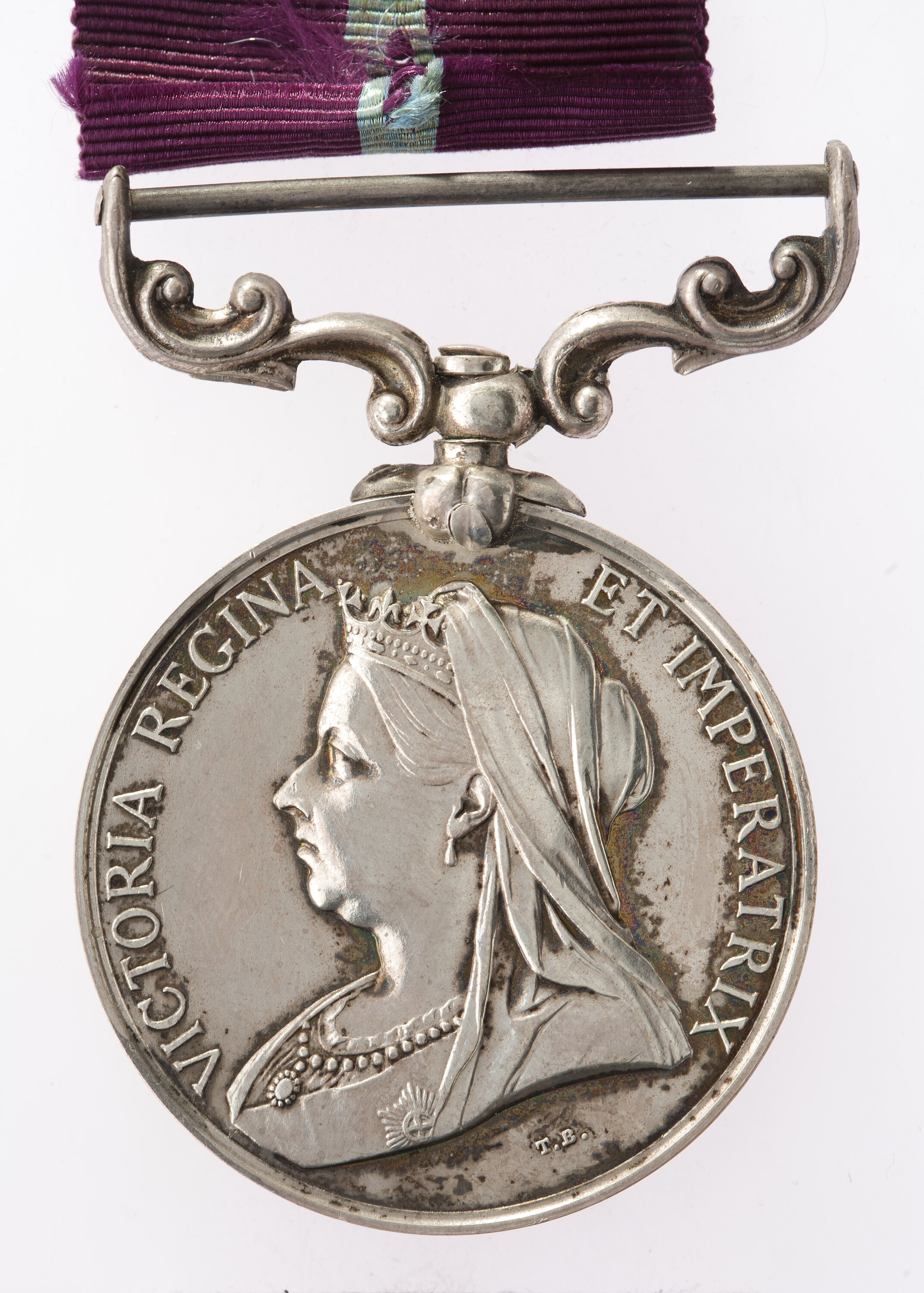 A diademmed and veiled bust of Queen Victoria, facing left; around, VICTORIA REGINA ET IMPERATRIX; the artist's initials T.B. below the bust.