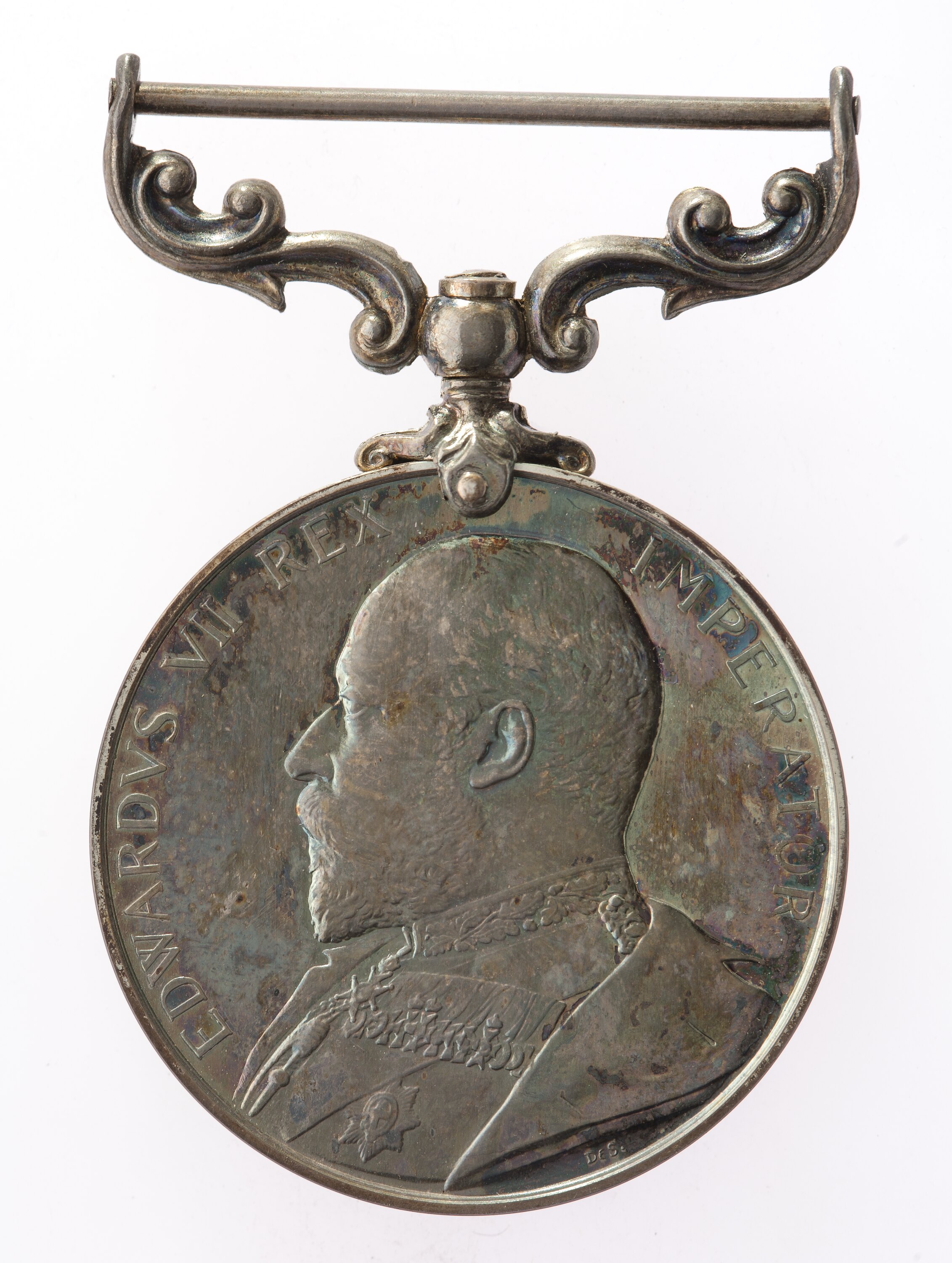 A bust of Edward VII in field marshal's uniform, head bare facing left; around, EDWARDVS VII REX IMPERATOR; the artist's initials DES (William de Saulles) below the bust.