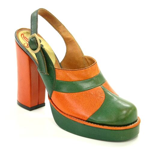 Sling-back platform with uppers of green and orange leather in several scalloped and branded panels. Fastens with strap at side. Sole incomplete - cork lining visible.