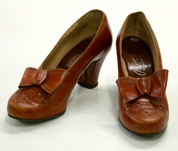 Pair of mid-brown leather woman's court shoes with medium heel, bow on throat and punched toe. Made in the 1930s by Paragon for Buckley & Nunn - London, Melbourne and Paris.