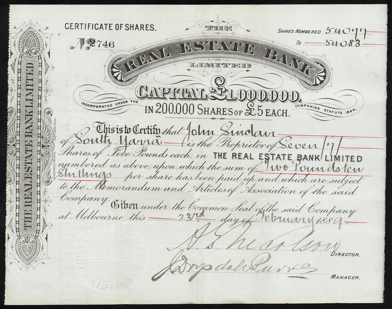 The Real Estate Bank Ltd. Issued to John Sinclair of South Yarra, Victoria, Australia.