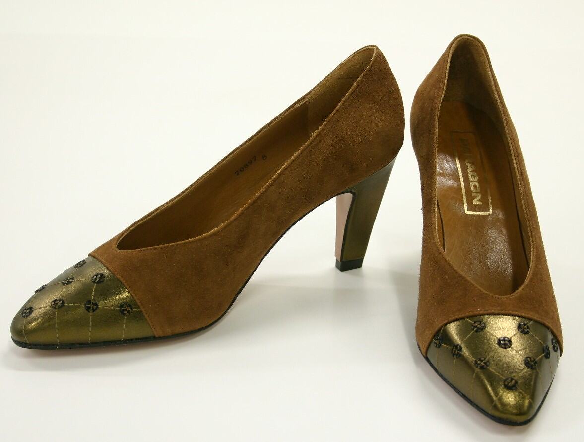 Pair of Paragon court shoes with pointed chisel toe and high heel. Uppers are light brown suede; toe cap and heel in bronze leather. Toe further decorated with machine stitching in grid with small discs of black and brown leather.