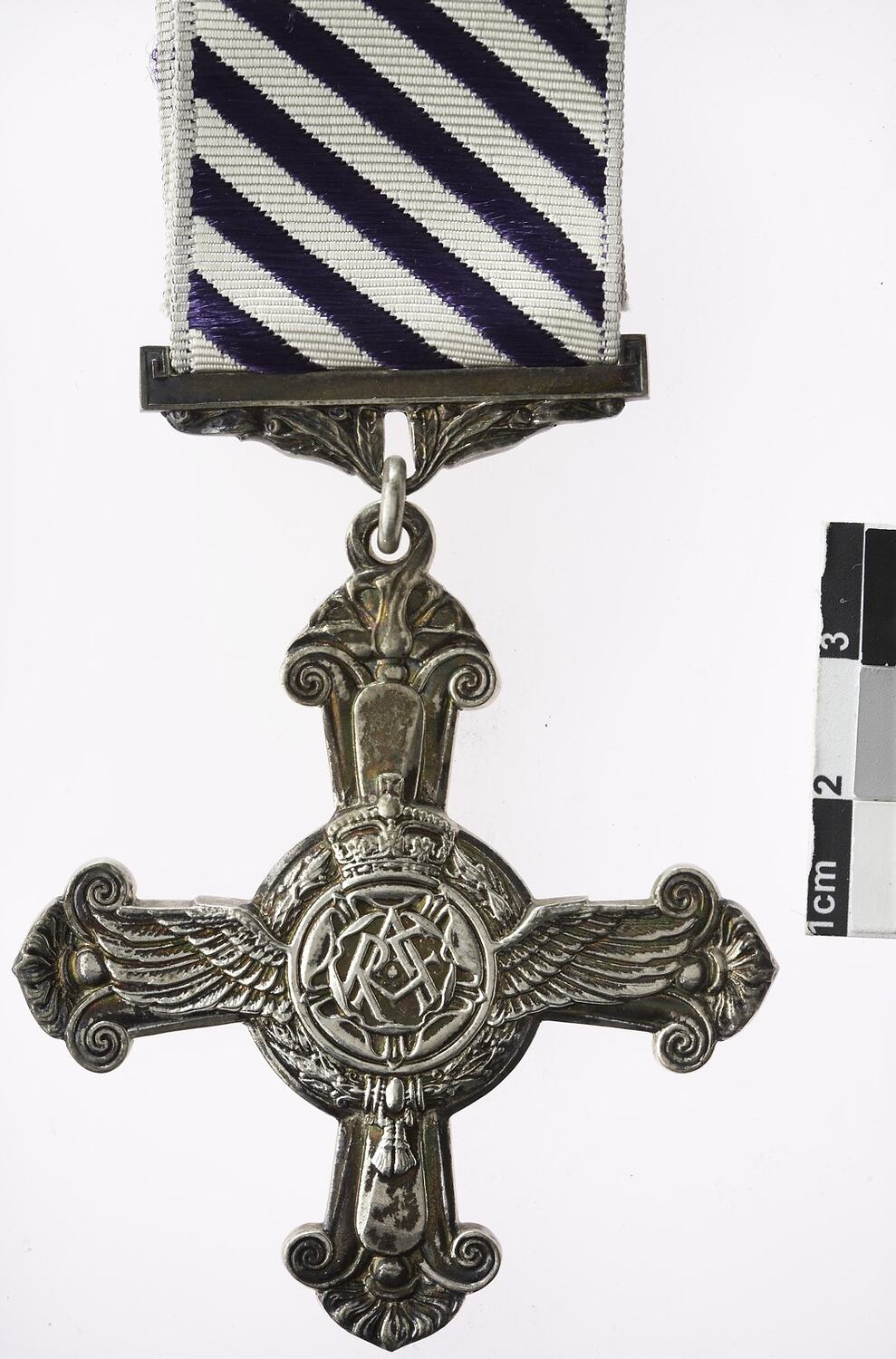 A silver cross flore with arms terminating with roses, the top arm ends with a loop to which is attached a silver ribbon suspender bar decorated with laurel with diagonally striped purple and white ribbon. The horizontal arms of the cross are decorated with eagle wings while the vertical have propeller blades; at the centre, within a laurel wreath is the crowned RAF monogram on a rose.