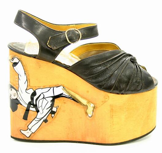 Right platform shoe made by Woolerton & Wilson, with high wooden sole decorated with Kung Fu sticker on side. A label on the sole indicates that the shoe was model 417, and that it was Woolerton & Wilson's 'fabulous Kung Fu shoe which stopped the traffic at the recent London shoe show'. Supplies were available on a quota basis due to a limited supply. The shoe was available in blue or beige pearl with black patent, and the factory price was 5.75 pounds. Appears to be dated 1975.