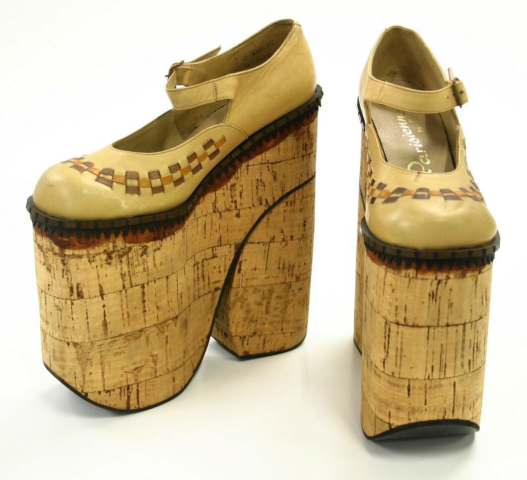 Pair of cork-heeled high platform shoes with tan uppers, featuring woven leather design. Made in the 1970s by Paragon, range Parisienne, Lacey design. Cork is partly stained, suggesting the shoes are incomplete.