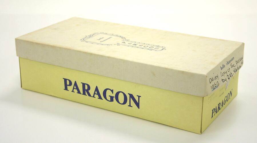 Printed and written on lid: "belle / chaussure / PARAGON / belle chaussure / DAISY Copy of shoe purchased / 1969 by D.H.D. Florence 1969" (note: should be DD for Diana Davison) Printed and written on box: "PARAGON / matches JoT Dress / given to" (refers to the fact that the shoes within were worn with a dress purchased from the Jot boutique).