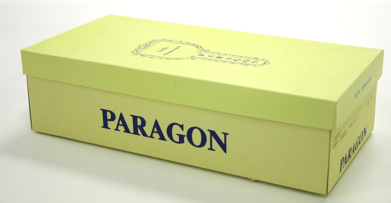 Yellow cardboard, rectangular shaped, Paragon, lidded shoe box, with "belle chaussure, Paragon", printed in blue on lid, and sides of box.