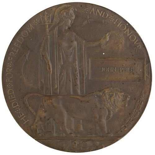 A circular bronze plaque with cardboard container that the plaque was originally mailed in. It features Britannia, classically robed and helmeted, standing facing right, holding a modest laurel wreath crown in her extended left hand and supporting a trident by her right side with her right arm and hand. In the foreground a male lion stands facing right; the animal was originally described as 'striding forward in a menacing attitude' which may explain its unusually low profile. Above the lion's head is a rectangular panel containing the name of the deceased, JOHN PEILE. To the right of Britannia's head and by the side of her right arm is a small dolphin, a reference to British sea-power. At the lower right edge is a branch of oak leaves and acorns. Around the edge, HE + DIED + FOR + FREEDOM + + AND + HONOUR. In exergue, in symbolic confrontation, a lion pounces on an eagle: a reference to the desired destruction of the Central Powers. The artist, E Carter Preston's initials, ECRP, were embossed above the lion's right forepaw.