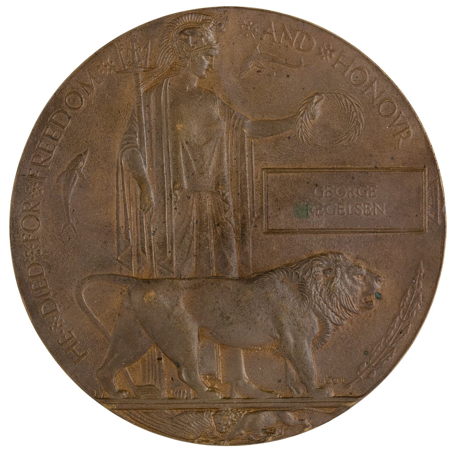A circular bronze plaque with cardboard container that the plaques were mailed in. It features Britannia, classically robed and helmeted, standing facing right, holding a modest laurel wreath crown in her extended left hand and supporting a trident by her right side with her right arm and hand. In the foreground a male lion stands facing right; the animal was originally described as 'striding forward in a menacing attitude' which may explain its unusually low profile. Above the lion's head is a rectangular panel containing the name of the deceased, GEORGE REGELSEN. To the right of Britannia's head and by the side of her right arm is a small dolphin, a reference to British sea-power. At the lower right edge is a branch of oak leaves and acorns. Around the edge, HE + DIED + FOR + FREEDOM + + AND + HONOUR. In exergue, in symbolic confrontation, a lion pounces on an eagle: a reference to the desired destruction of the Central Powers. The artist, E. Carter Preston's initials, ECRP, were embossed above the lion's right forepaw.