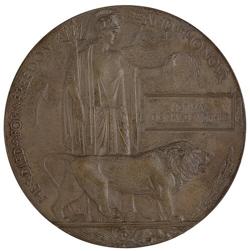A circular bronze plaque (120 mm diameter) with cardboard container that the plaque was originally mailed in and memorial Scroll from George V. It features Britannia, classically robed and helmeted, standing facing right, holding a modest laurel wreath crown in her extended left hand and supporting a trident by her right side with her right arm and hand. In the foreground a male lion stands facing right; the animal was originally described as 'striding forward in a menacing attitude' which may explain its unusually low profile. Above the lion's head is a rectangular panel containing the name of the deceased, NORMAN DONALD McPHEE. To the right of Britannia's head and by the side of her right arm is a small dolphin, a reference to British sea-power. At the lower right edge is a branch of oak leaves and acorns. Around the edge, HE + DIED + FOR + FREEDOM + + AND + HONOUR. In exergue, in symbolic confrontation, a lion pounces on an eagle: a reference to the desired destruction of the Central Powers. E Carter Preston's initials, ECRP, were embossed above the lion's right forepaw.