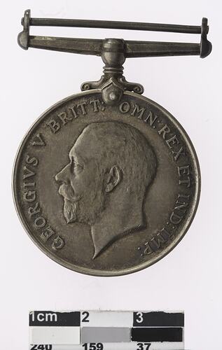 Obverse; 'GEORGIVS V BRITT: OMN: REX ET IND: IMP:'. 'B.M.' (Bertram MacKennal - artist). Reverse; '1914 1918'. Edge; '2268 SJT. D. WILLIS. 6 BN. A.I.F.'.