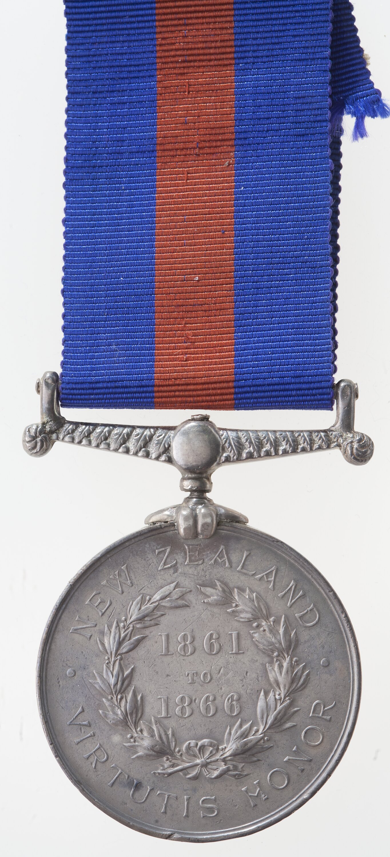 A laurel wreath around the dates '1861 TO 1866'; around above, 'NEW ZEALAND', around below 'VIRTUTIS HONOR'.