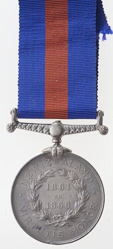 Silver dated medal with mount and ribbon. The obverse features a diademed bust of Queen Victoria facing left with veil, around, 'VICTORIA D:G: BRITT: REG: F:D:'; the artists names, 'J.S. & A.B. WYON' weakly struck below bust. The reverse features a laurel wreath around the dates '1861 TO 1866'; around above, 'NEW ZEALAND', around below 'VIRTUTIS HONOR'. The edge indented 'J. KINGSLEY 1ST. WAIKATO REGT.'.