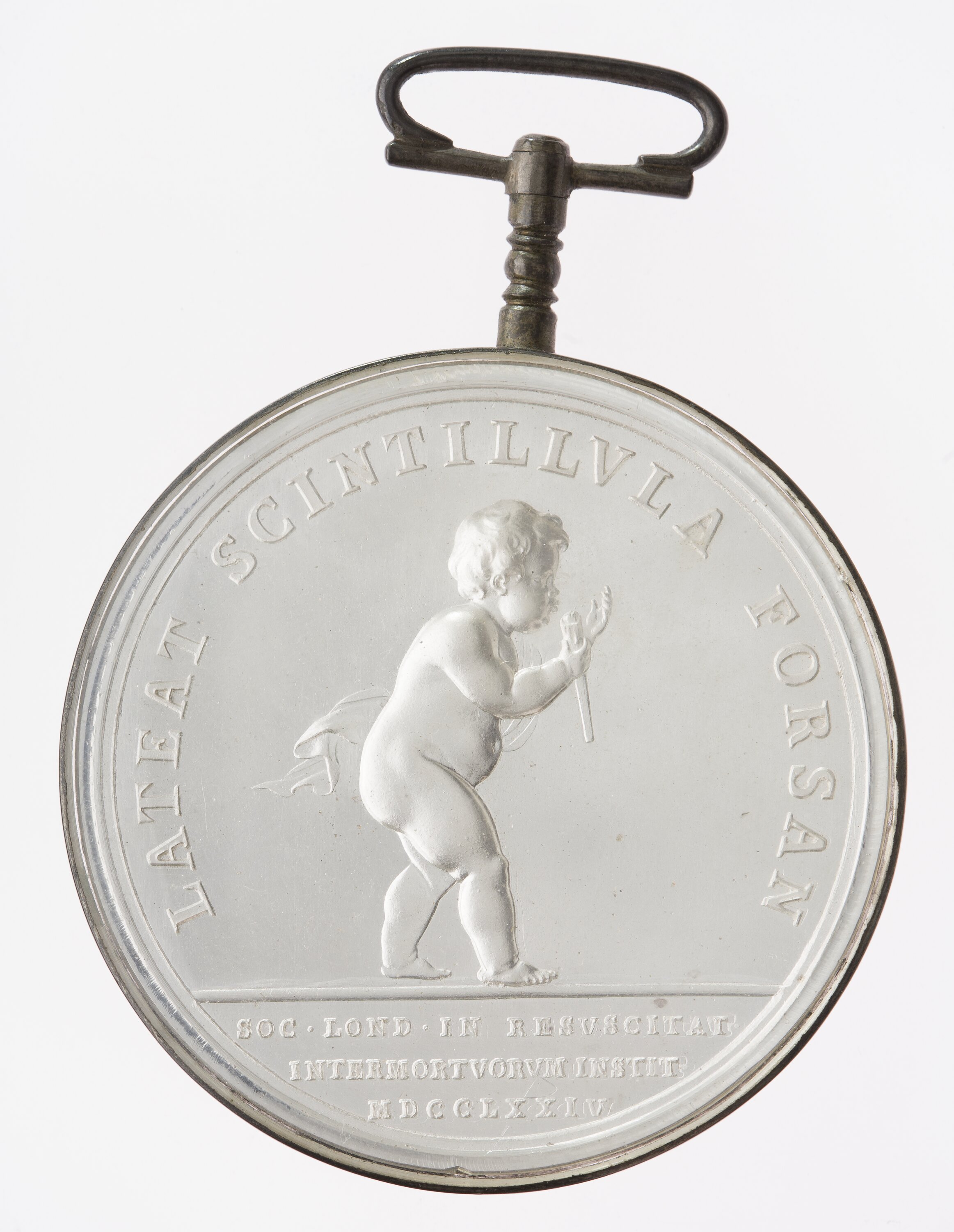 A cherub advancing right, naked except for flowing cape, blowing on a burnt-out torch which is held in right hand, left hand protects top of torch from wind that blows the cape; around, LATEAT SCINTILLVLA FORSAN (Translation - perhaps a tiny spark is concealed); in exergue, SOC. LOND. IN RESUSCITAT INTERMORTUORUM INSTIT. MDCCLXXIV (Translation - The London Society for the resuscitation of those in a state of suspended animation, instituted 1774).
