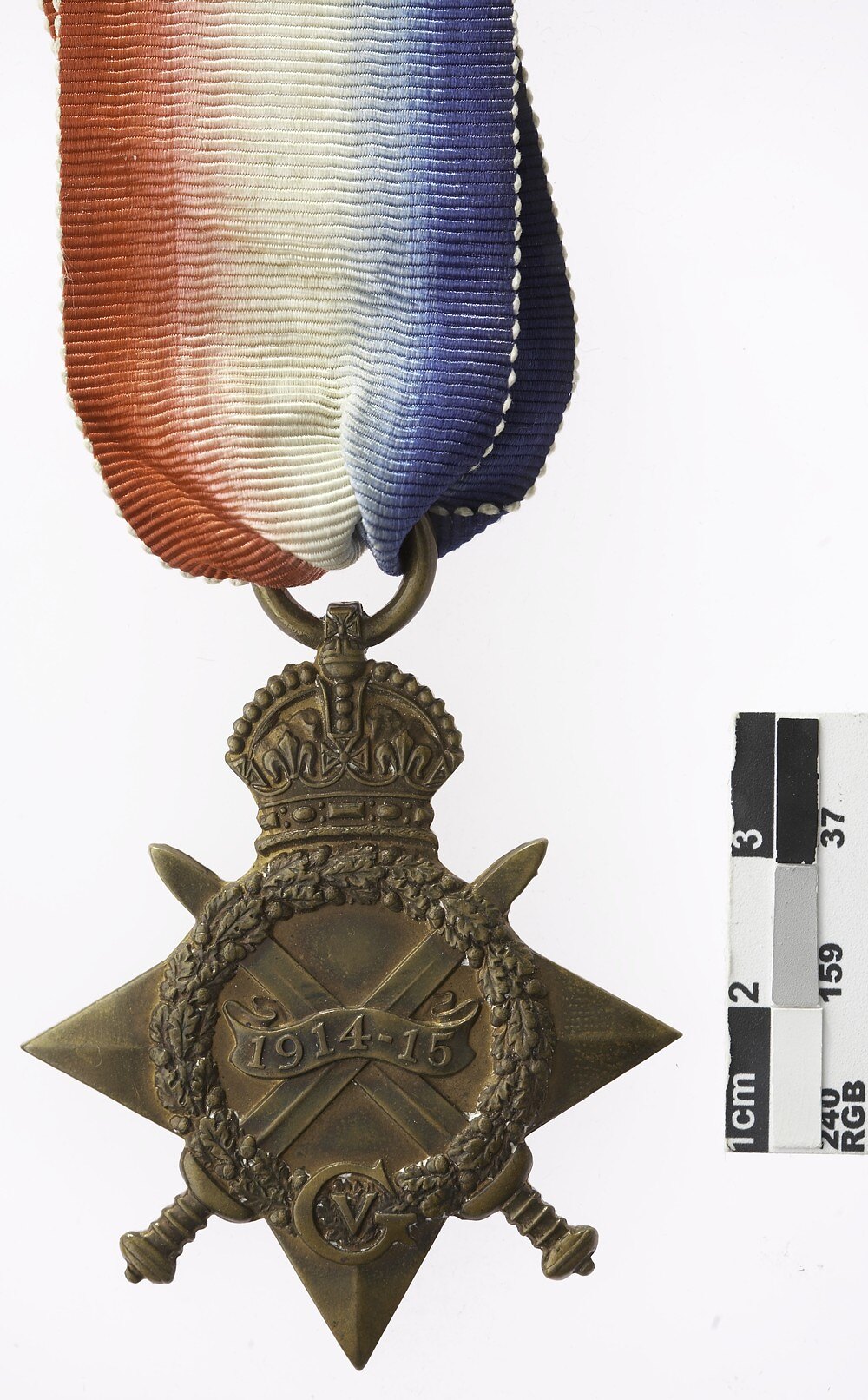 Four pointed star with the top point replaced by a crown with attached loop and ribbon, crossed swords project between the points of the star and at the centre, within an oak wreath, a scroll crossing the swords reads '1914-15'; at the base of the wreath is a large 'G' which encloses a 'V' (King George V).