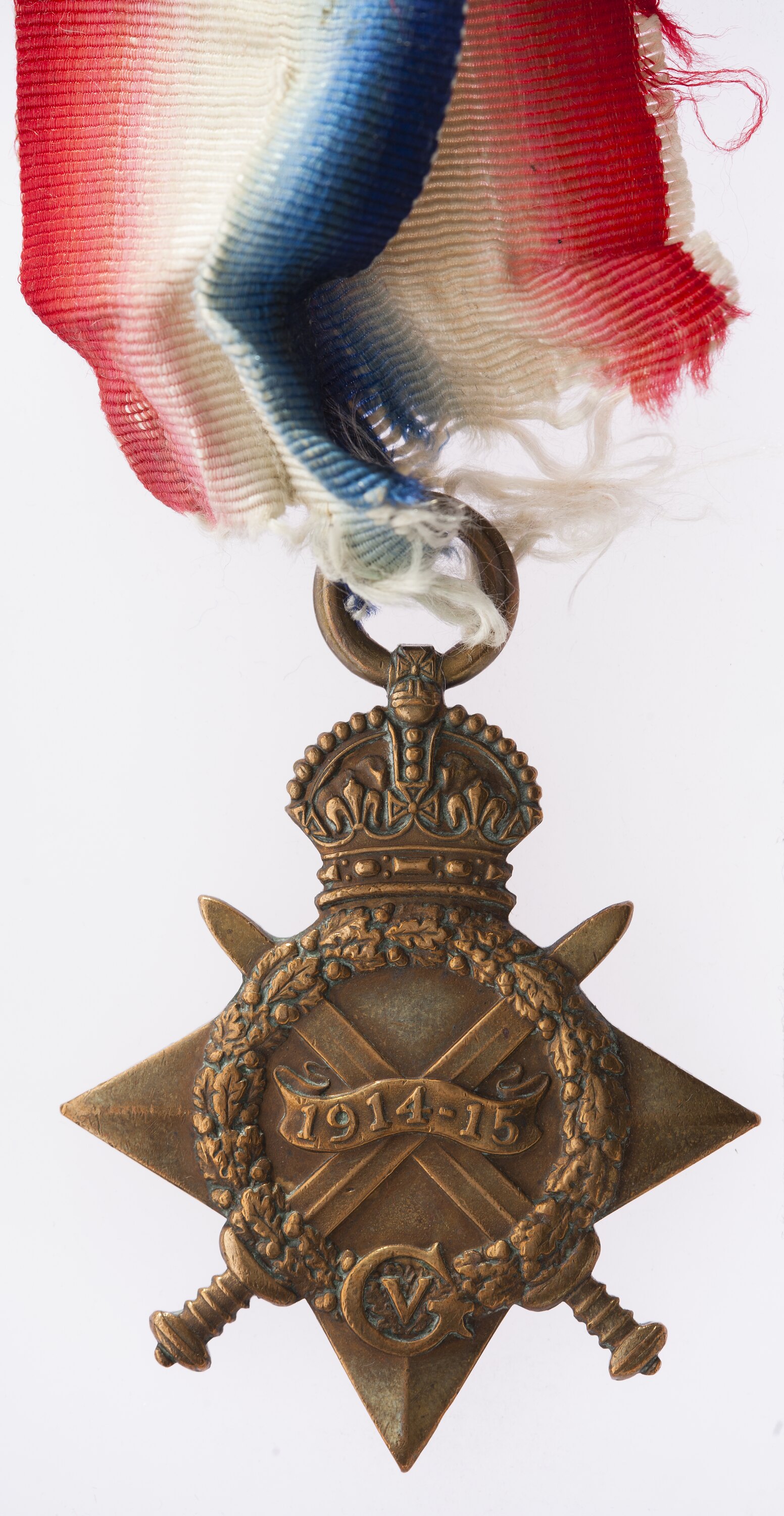 Four pointed star with the top point replaced by a crown with attached loop and ribbon, crossed swords project between the points of the star and at the centre, within an oak wreath, a scroll crossing the swords reads '1914-15'; at the base of the wreath is a large 'G' which encloses a 'V' (King George V).
