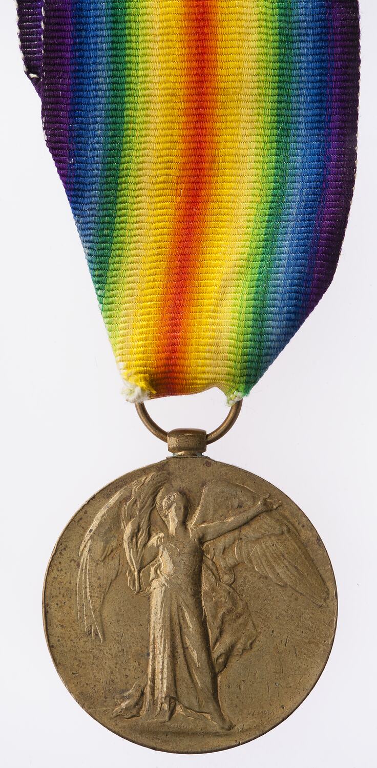 The Victory Medal was authorised in 1919 and was awarded to army, navy and air force personnel who served in a theatre of war between midnight 4th-5th August 1914 and midnight 11th-12th November 1918. The Allies resolved that, if they wished to issue a Victory Medal, it would share a common feature of a depiction of Victory on the obverse and a ribbon of red, yellow, green, blue and violet merged into a rainbow pattern. This medal, that of Great Britain, was awarded to personnel from countries in the British Empire (some 5,725,000 were issued). The other Allied countries that issued Victory medals were: Belgium, Brazil, Cuba, Czechoslovakia, France, Greece, Italy, Japan, Portugal, Romania, Thailand, Union of South Africa and the United States of America.