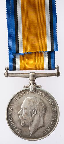 Obverse; 'GEORGIVS V BRITT: OMN: REX ET IND: IMP:'. 'B.M.' (Bertram MacKennal - artist). Reverse; '1914 1918'. Edge; '1586 C.H. NOWELL. A.B. R.A.N.'.
