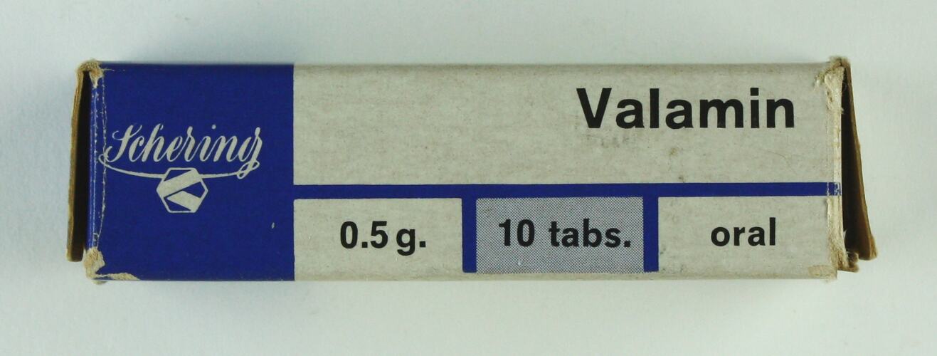 Packet for drug Valamin, made by Schering AG Berlin and distributed in Australia by Schering Pty. Ltd. Sydney. Valamin is the trade name for the active ingredient Ethinamate, a sedative-hypnotic. Stocked in the pharmacy of a mental hospital in Victoria and administered to patients suffering from insomnia or other sleep disturbances.