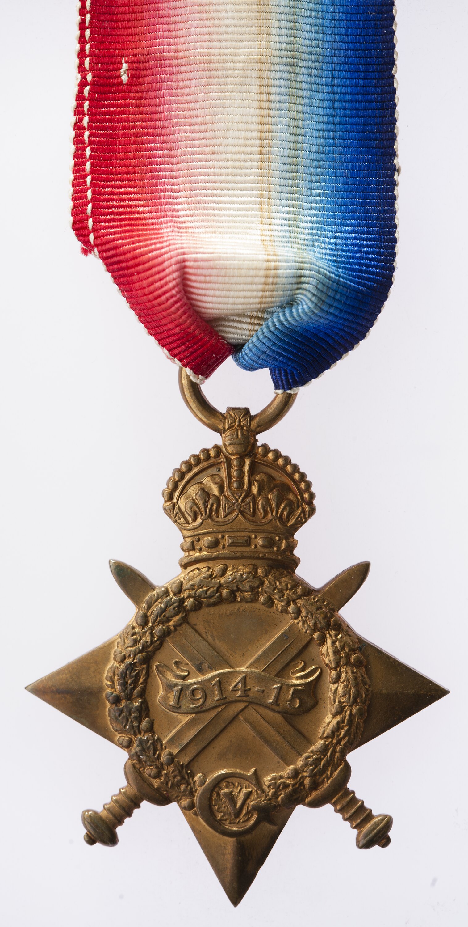 Four pointed star with the top point replaced by a crown with attached loop and ribbon, crossed swords project between the points of the star and at the centre, within an oak wreath, a scroll crossing the swords reads '1914-15'; at the base of the wreath is a large 'G' which encloses a 'V' (King George V).