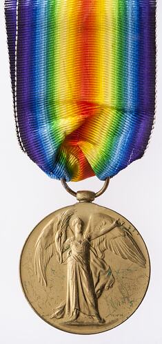 The Victory Medal was authorised in 1919 and was awarded to army, navy and air force personnel who served in a theatre of war between midnight 4th-5th August 1914 and midnight 11th-12th November 1918. The Allies resolved that, if they wished to issue a Victory Medal, it would share a common feature of a depiction of Victory on the obverse and a ribbon of red, yellow, green, blue and violet merged into a rainbow pattern. This medal, that of Great Britain, was awarded to personnel from countries in the British Empire (some 5,725,000 were issued). The other Allied countries that issued Victory medals were: Belgium, Brazil, Cuba, Czechoslovakia, France, Greece, Italy, Japan, Portugal, Romania, Thailand, Union of South Africa and the United States of America.