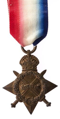 Four pointed star with the top point replaced by a crown with attached loop and ribbon, crossed swords project between the points of the star and at the centre, within an oak wreath, a scroll crossing the swords reads '1914-15'; at the base of the wreath is a large 'G' which encloses a 'V' (King George V).