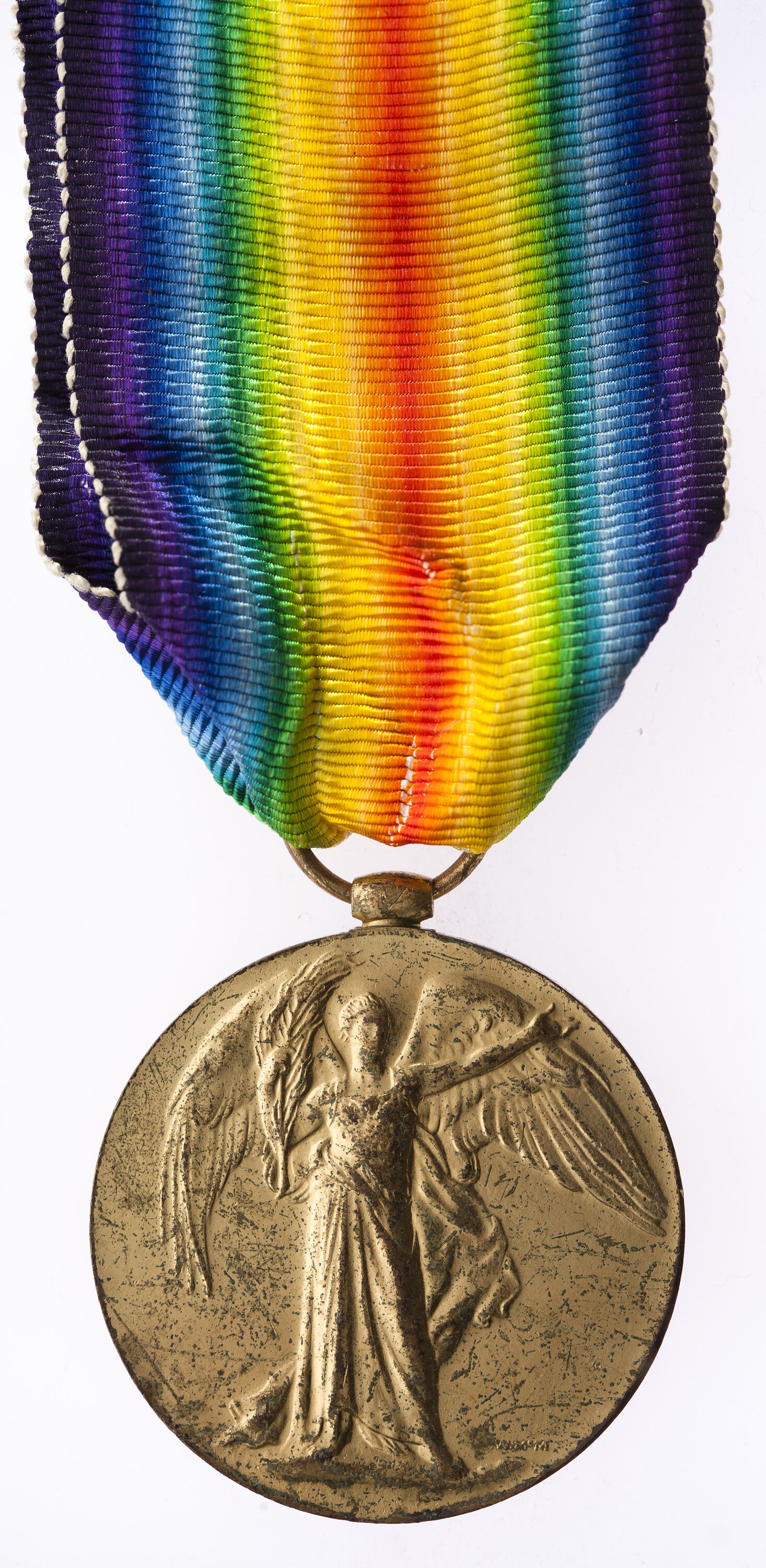 The Victory Medal was authorised in 1919 and was awarded to army, navy and air force personnel who served in a theatre of war between midnight 4th-5th August 1914 and midnight 11th-12th November 1918. The Allies resolved that, if they wished to issue a Victory Medal, it would share a common feature of a depiction of Victory on the obverse and a ribbon of red, yellow, green, blue and violet merged into a rainbow pattern. This medal, that of Great Britain, was awarded to personnel from countries in the British Empire (some 5,725,000 were issued). The other Allied countries that issued Victory medals were: Belgium, Brazil, Cuba, Czechoslovakia, France, Greece, Italy, Japan, Portugal, Romania, Thailand, Union of South Africa and the United States of America.