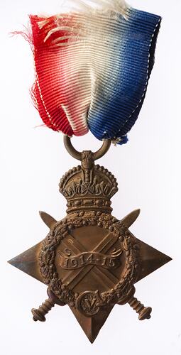 Four pointed star with the top point replaced by a crown with attached loop and ribbon, crossed swords project between the points of the star and at the centre, within an oak wreath, a scroll crossing the swords reads '1914-15'; at the base of the wreath is a large 'G' which encloses a 'V' (King George V).